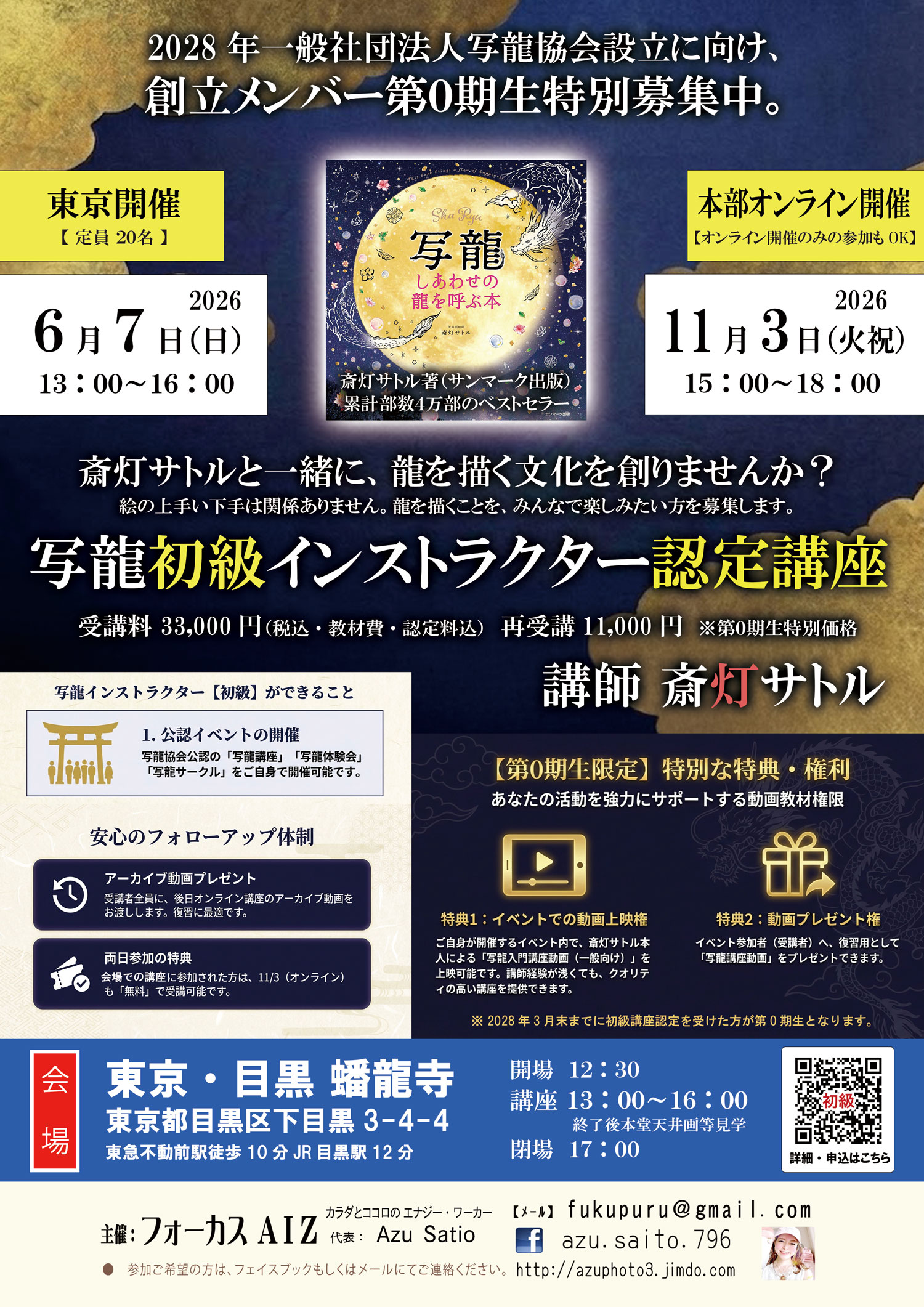 【日時】 2026年6月7日(日) 12:30 開場 13:00 3時間講座 16:00 終了後本堂天井画見学等 17:00 閉場 ※11月3日オンライン講座も無料受講可。 (詳細は当日会場 … 続きを読む 東京都目黒区■写龍初級