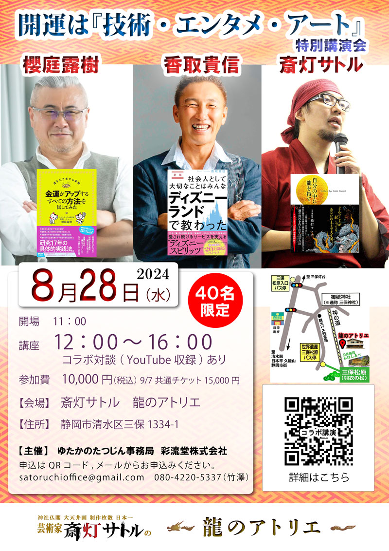 ・ ・ 【日時】 2024年 8月28日(水) 11:00 開場 12:00~16:00 コラボ対談(YouTube収録)あり 【タイトル】 ■櫻庭露樹&香取貴信&斎灯サトル コラボ講演会 開運は『技術・エンタメ・アート … 続きを読む 【龍のアトリエにて開催】静岡市清水区 8/28(水)■櫻庭露樹&香取貴信&斎灯サトル コラボ講演会 開運は『技術・エンタメ・アート』