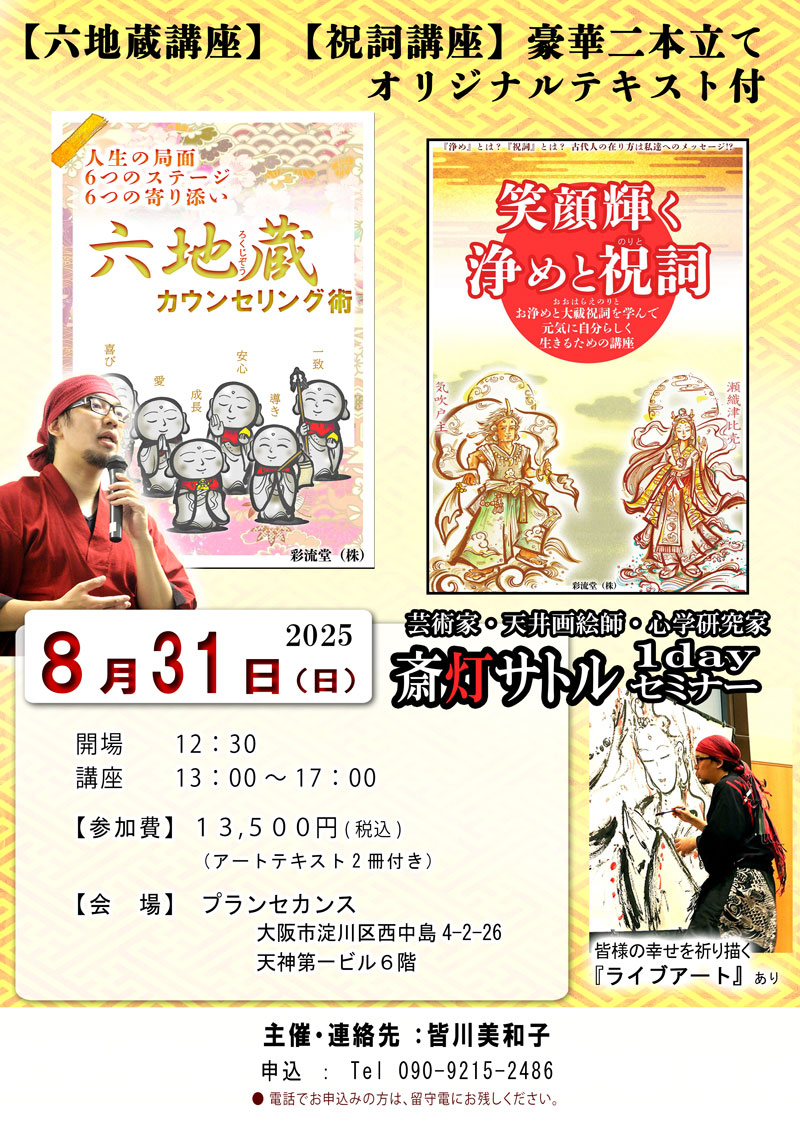 【日時】 2025年8月31日(日) 開場 12:30 開演 13:00~17:00 【講師】 斎灯サトル (芸術家・心学研究家) 【会場】 プランセカンス 大阪市淀川区西中島4-2-26 天神第一ビル6階 【参加費】 … 続きを読む 大阪市淀川区 8/31(日)■二本立て講座 『六地蔵カウンセリング術』『笑顔輝く浄めと祝詞』