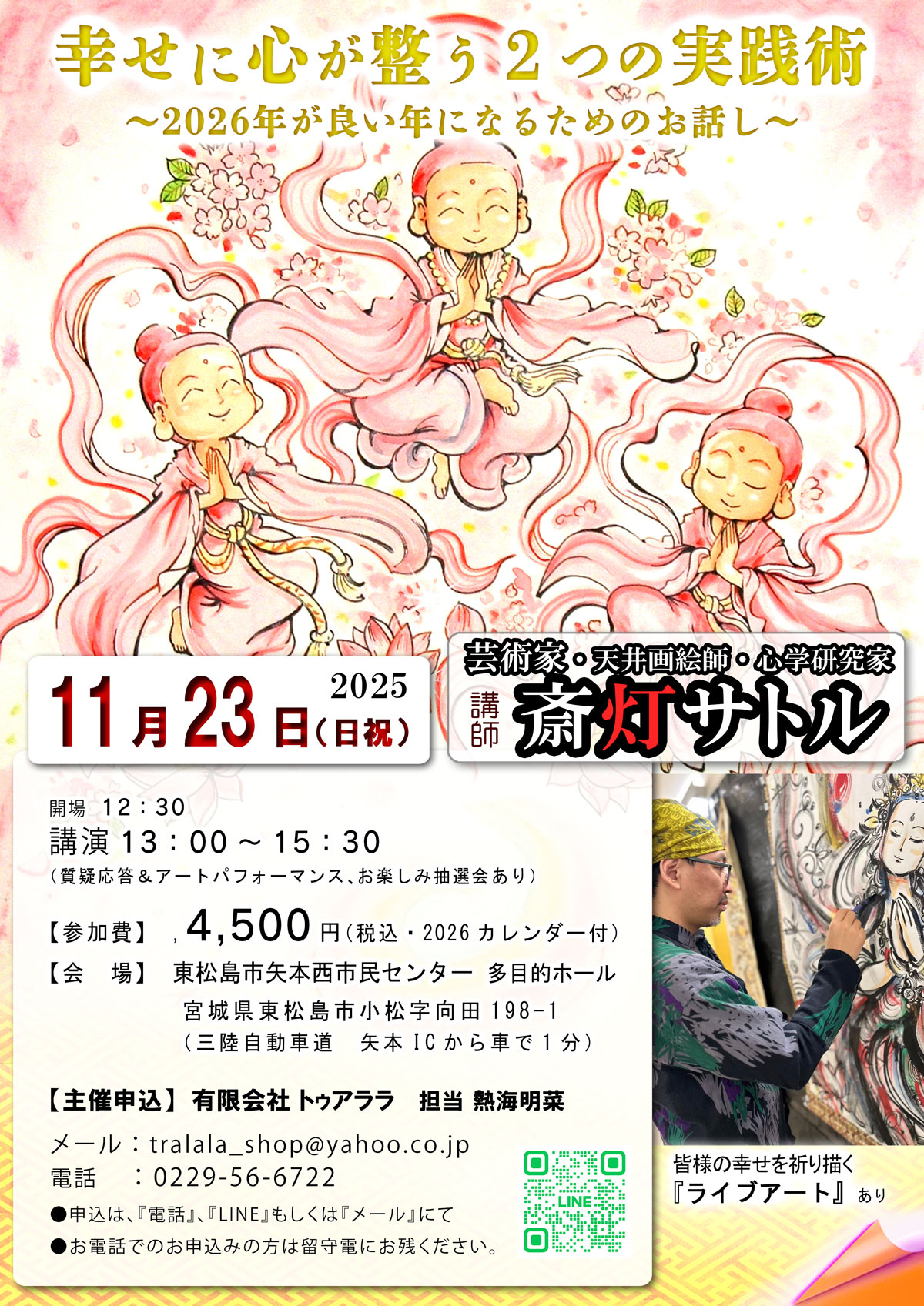 【日時】 2025年11月23日(日祝) 開場 12:30 開演 13:00~15:30 (質疑応答&アートパフォーマンス、お楽しみ抽選会あり) 【講師】 斎灯サトル (芸術家・心学研究家) 【参加費】 4,500円(税 … 続きを読む 宮城県東松島市 11/23(日祝) ■講演 『幸せに心が整う2つの実践術 ~2026年が良い年になるためのお話し~』